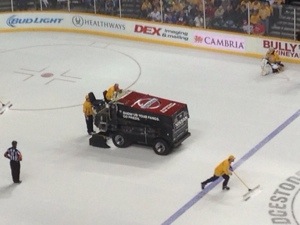 As per the NHL’s protocol, the Zamboni’s came out onto the ice to do a dry scrape of the middle of the Bridgestone Arena ice prior to the commencement of the tiebreaker.