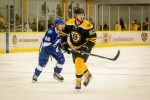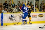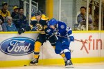 - Tampa’s Dylan Blujus hits Boston’s Brian Ferlin into the right boards. (Jim Diamond/Rinkside Report)