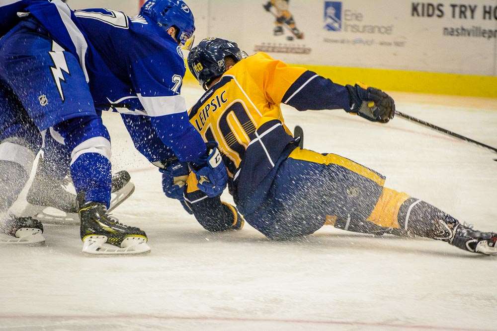 Predators-Bolts Rookie Game-19 ← Previous Next → Predators forward Brendan Leipsic is given a rough ride to the ice courtesy of Tampa Bay’s jonathan Drouin.