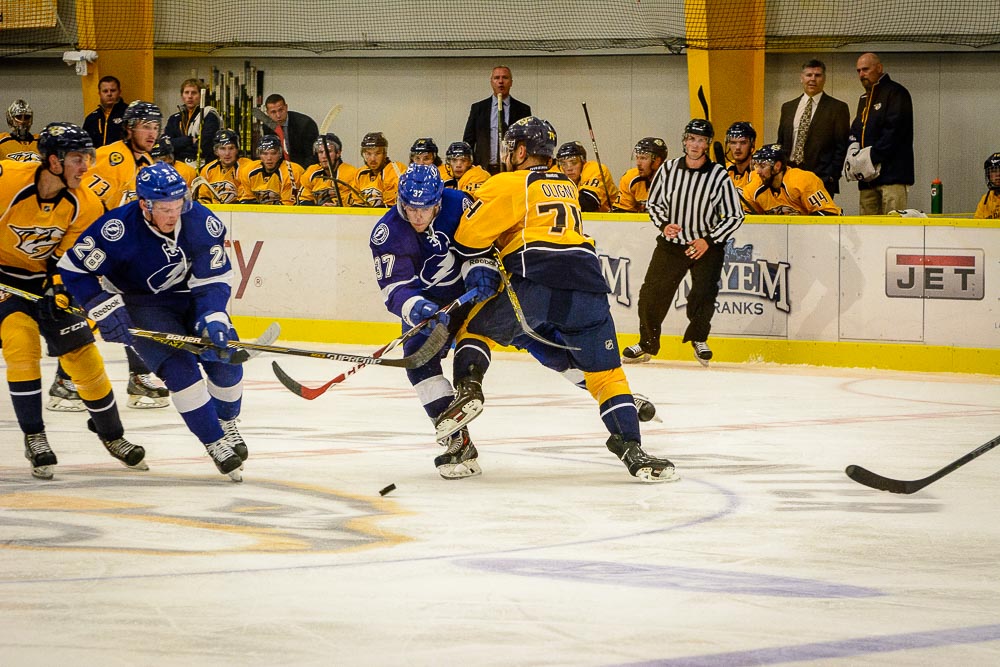 Predators-Bolts Rookie Game-3 ← Previous Next → Nashville’s Jimmy Oligny delivers a hit on Tampa Bay’s Cameron Darcy at center Ice.