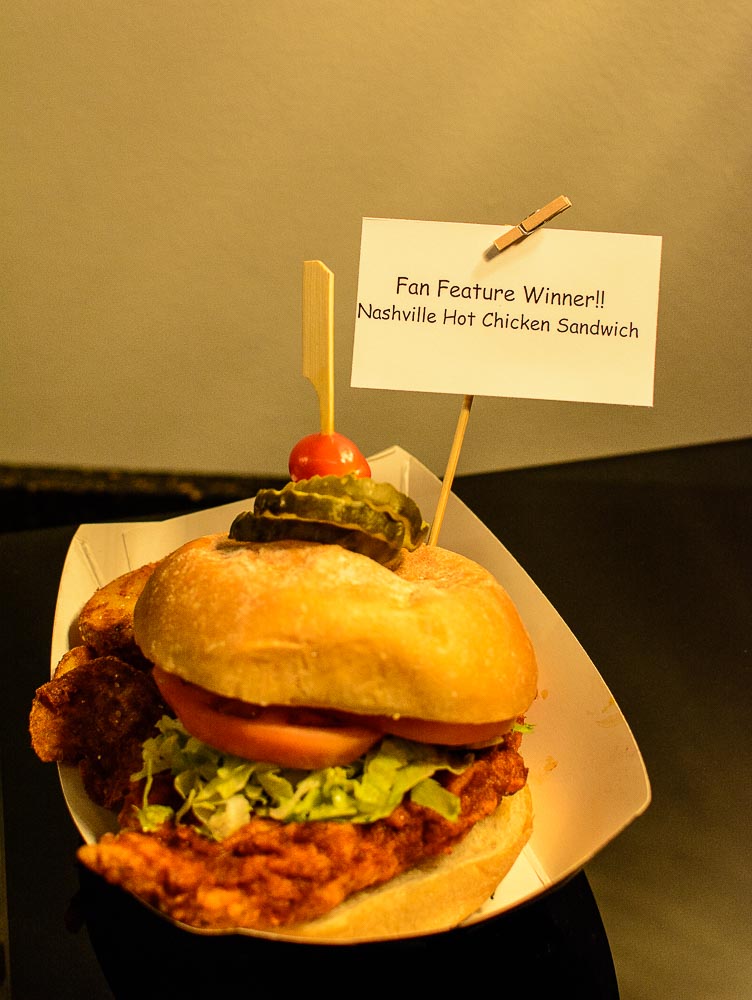 Nashville hot chicken was introduced last year. Bridgestone head Chef Wade made a slight adjustment this year, moving from bone-in chicken to a boneless variety and placing it in a bun. Chef Wade thinks hot chicken 2.0 is more portable and therefore more conducive to in-arena dining.