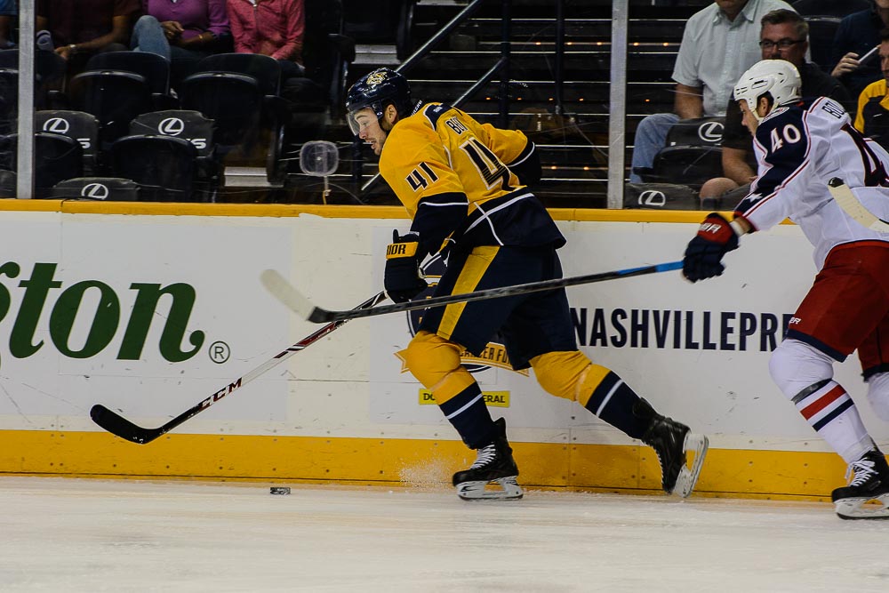 Preds-Jackets-3 ← Previous Next → Taylor Beck skates away from the stick check of Jared Boll. (Jim Diamond/Rinkside Report)
