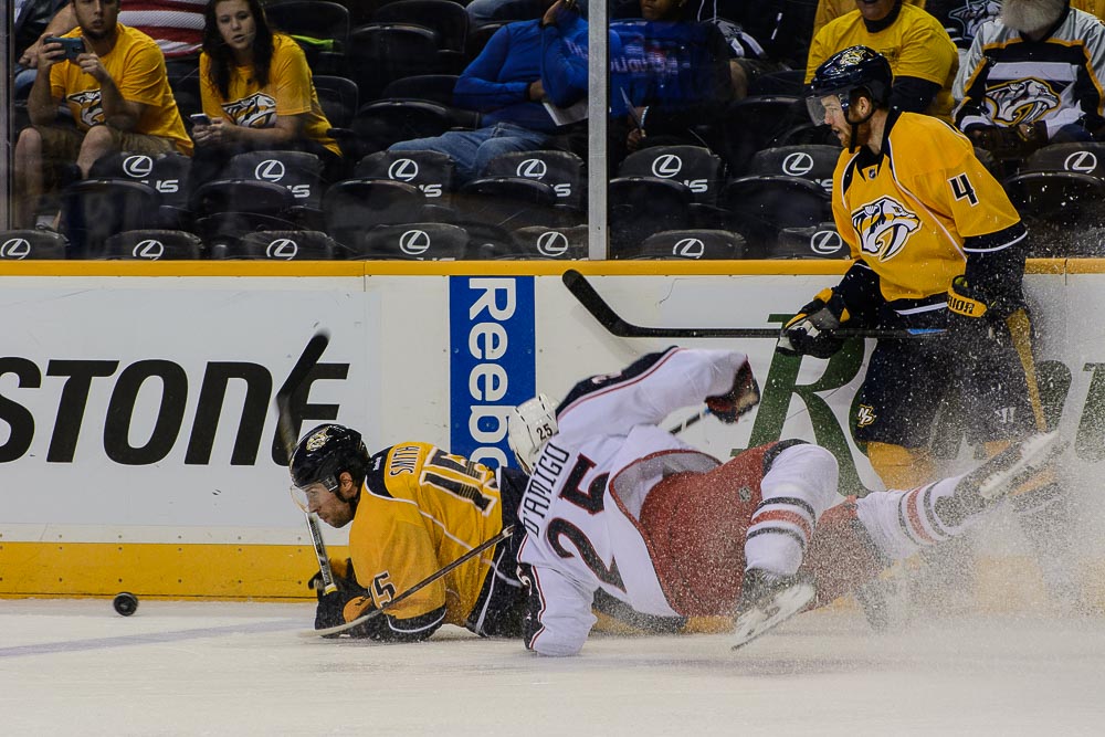 Preds-Jackets-5 ← Previous Next → Craig Smith gets tied up with former RPI Engineer Jerry D’Amigo. (Jim Diamond/Rinkside Report)