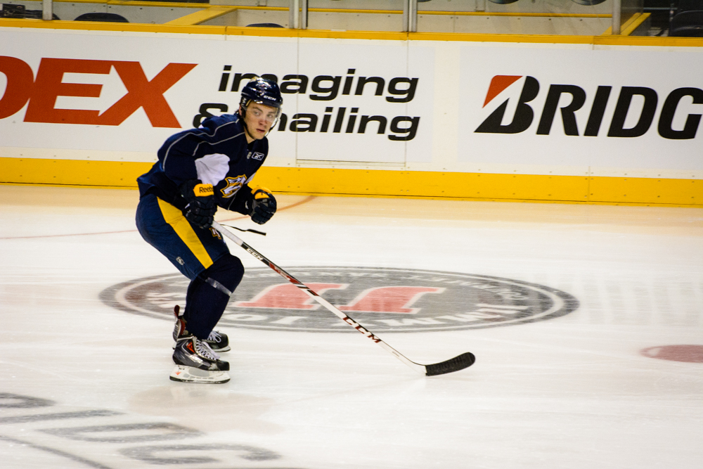 DevCamp14NoonanJJ Defenseman Garrett Noonan skates backwards through the neutral zone. Side note, Jimmy John’s is now an on-ice sponsor of the Predators.
